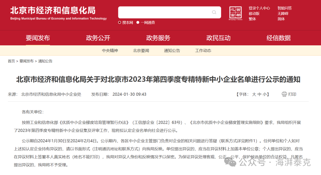 2024年1月30日,北京市經濟和信息化局發布通知公告《關于對北京市2023年度第四季度專精特新中小企業名單進行公示的通知》,海湃泰克(北京)生物醫藥科技有限公司憑借專業實力和創