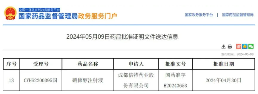 2024-05-21 13:48:37喜訊!近日,成都西嶺源藥業(yè)有限公司(以下簡(jiǎn)稱(chēng)“西嶺源藥業(yè)”)與成都倍特藥業(yè)股份有限公司(以下簡(jiǎn)稱(chēng)“倍特藥業(yè)”)合作開(kāi)發(fā)的碘佛醇注射液獲批生產(chǎn)(批準(zhǔn)文號(hào):國(guó)藥準(zhǔn)字H20243653)并視同